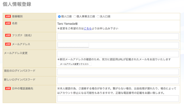 クィック登録が完了したらマイページにログインして個人情報を入力していきます。