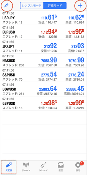 また、右上の「+」をタップすると通貨ペアや指数を追加表示させることができます。
