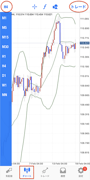 チャートが表示されます。左上には時間足の設定変更ボタンがあり、右上には注文を出せる「トレード」ボタンがあります。