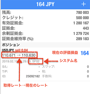 新規注文 #約定番号 / 買い(buy)or売り(sell) / 数量 / 通貨ペア / 約定レート / システム名(SF01やSF02)